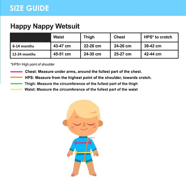 SplashAbout Happy Nappy Baby Wetsuit Up and Away is a warming and comfortable wetsuit for babies and young children with a built-in swim diaper. The wetsuit, which has sun protection UPF 50+, is made of 1 mm thick neoprene that keeps the baby warm during the bath. The lower part of the wetsuit is a smart Happy Nappy swim diaper with tight elastic around the legs to avoid unhygienic accidents in the pool. A wetsuit is perfect to use when the child is getting used to water and for swimming in colder water. SplashAbout's wetsuit is easy to put on with a zipper in the back.