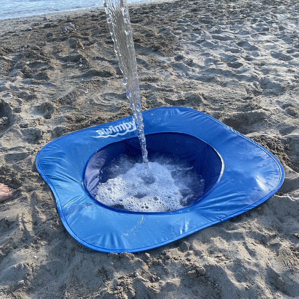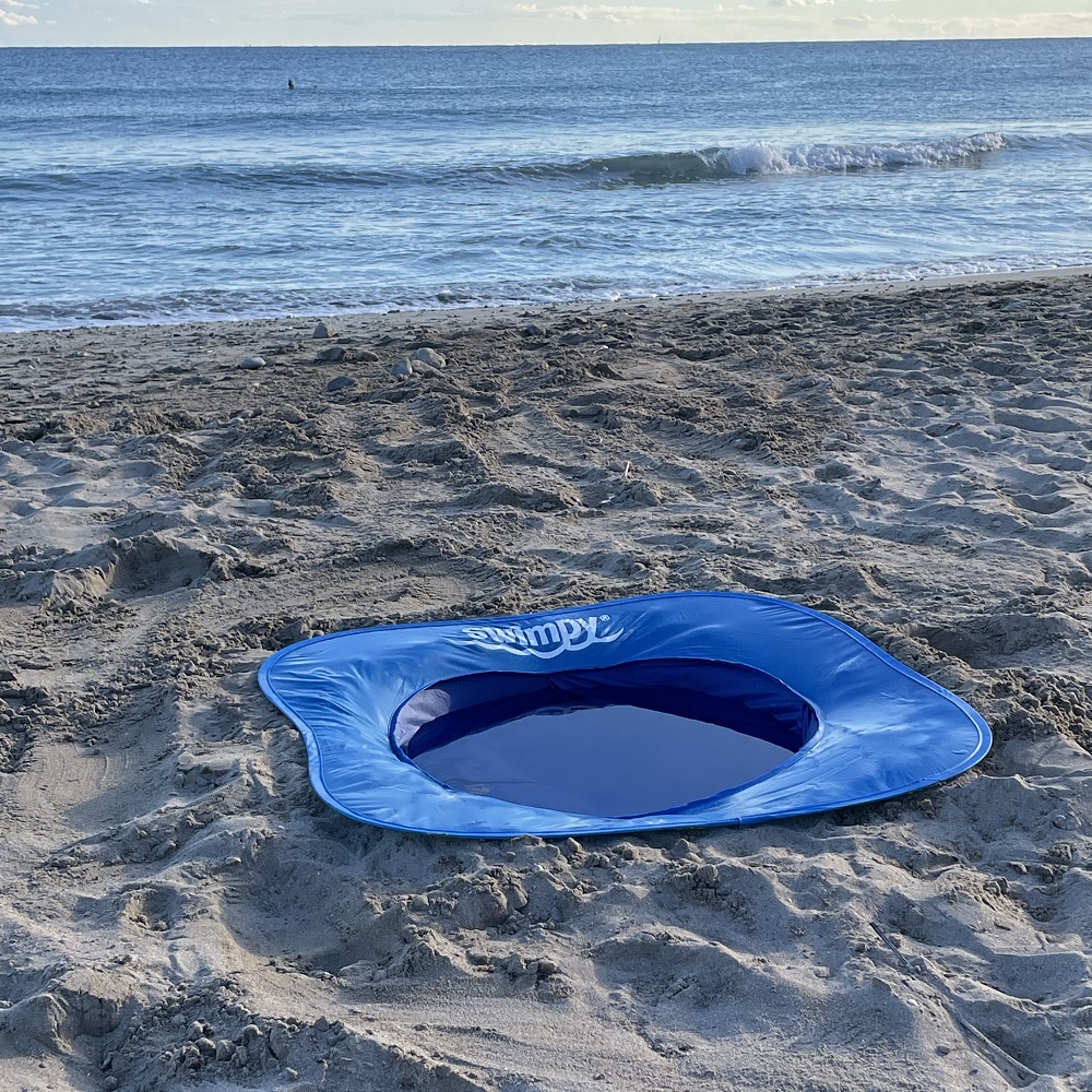 Swimpy Blue Beach Splash Pool is a smart and fun paddling pool for children that is foldable and becomes small and therefore easy to take to the beach and on the trip. When using the pool, a pit is dug in the sand and then the pool is placed on top and filled with water. The pool is 82 x 82 cm and weighs only about 150 grams.