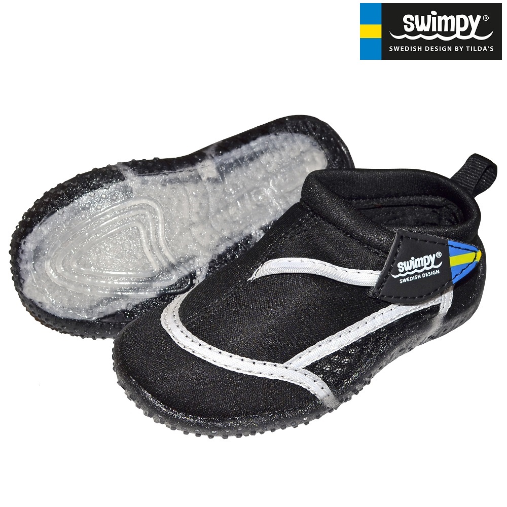 Swimpy Black are light and protective beach and swim shoes for children made of comfortable neoprene and mesh with soft fabric on the top. Swimpy beach shoes protect your children's feet from sharp rocks and hot sand on the beach through a heat-resistant sole in TPR rubber.