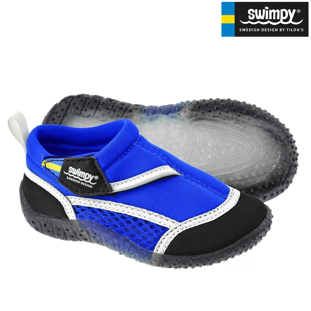 Swimpy Blue and Black are light and protective beach and swim shoes for children made of comfortable neoprene and mesh with soft fabric on the top. Swimpy beach shoes protect your children's feet from sharp rocks and hot sand on the beach through a heat-resistant sole in TPR rubber.