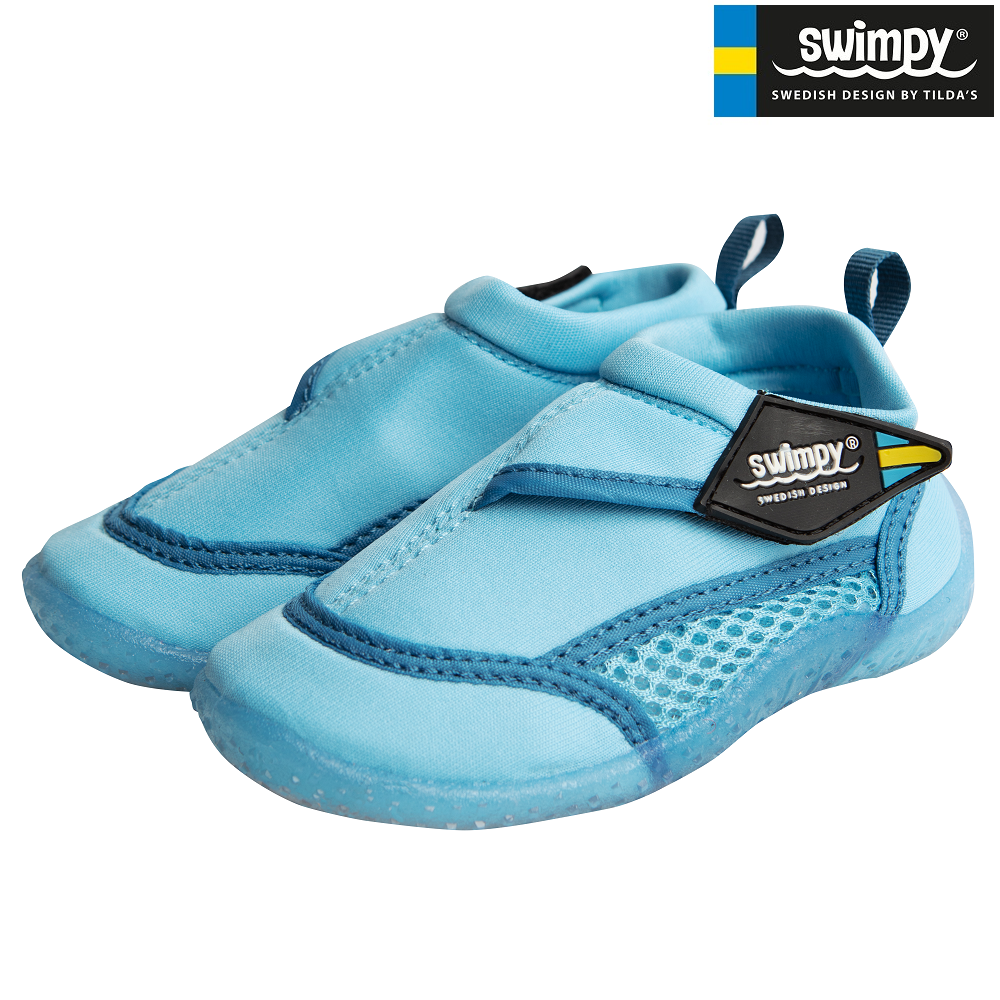Swimpy Light Turquoise are light and protective beach and swim shoes for children made of comfortable neoprene and mesh with soft fabric on the top. Swimpy beach shoes protect your children's feet from sharp rocks and hot sand on the beach through a heat-resistant sole in TPR rubber.