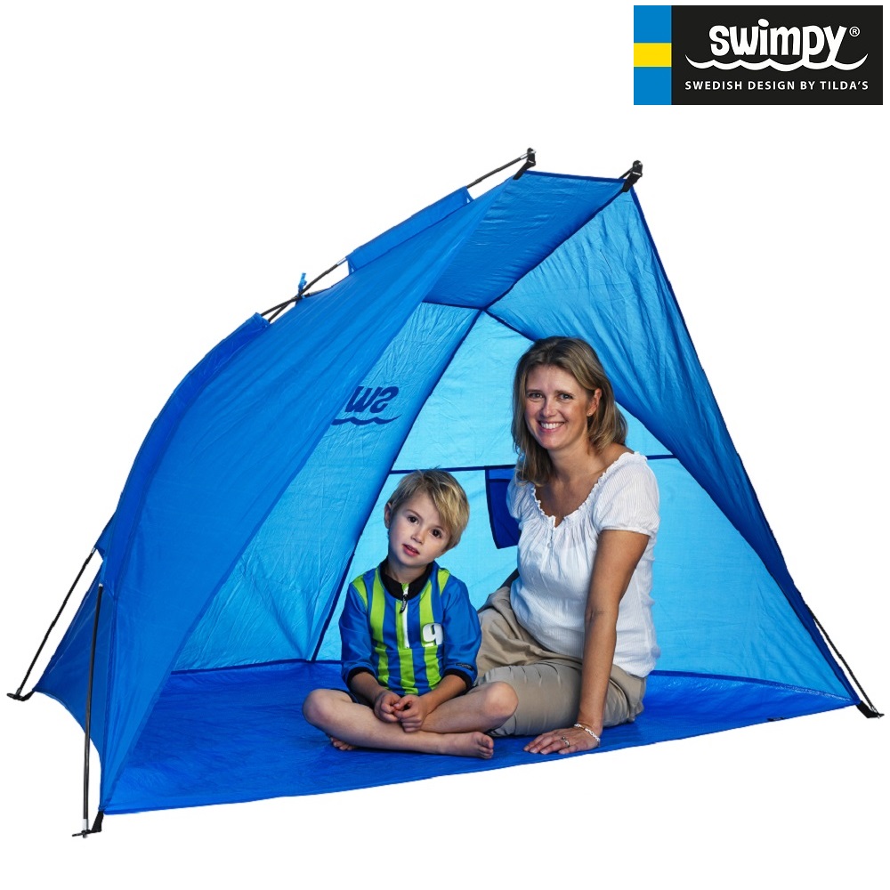 Swimpy Large Blue is a spacious and sturdy sun shelter beach tent (UV tent) for sunny days on the beach and in the home garden. The sun tent protects against the sun's ultraviolet rays (UV protection 30+) and provides nice shade. When the UV tent is not in use, it is packed in the accompanying transport and storage bag. Mounting loops and tent pegs (included) for windy days. The sun tent weighs only 1 kg and becomes small when packed (52 x 10 cm), which makes it easy to take to the beach and along on holiday trips.