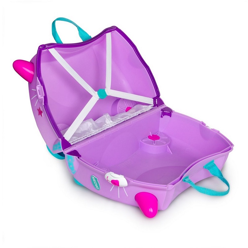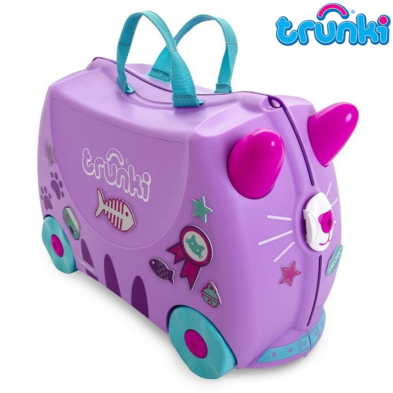 Fun, practical and award-winning ride on suitcase for children from Trunki. The suitcase Cassie the Cat has a comfy saddle to rest tired legs and to play with while waiting at the airport. Trunki suitcases are lightweith and durable (carries up to 50 kg), has horn grips for stability, a tow and carry strap and a carry handle. Inside the suitcase (18 liters of luggage space) there is lots of space for toys, games, teddy bears and snacks. As the size of Trunki suitcases fits within the IATA regulation of handlugage, the suitcase can be taken on board the aircraft (however, check with carrier beforehand, which rules apply to your airline).
