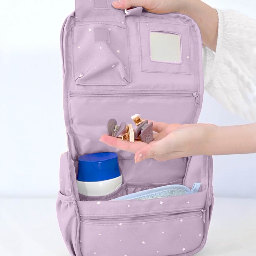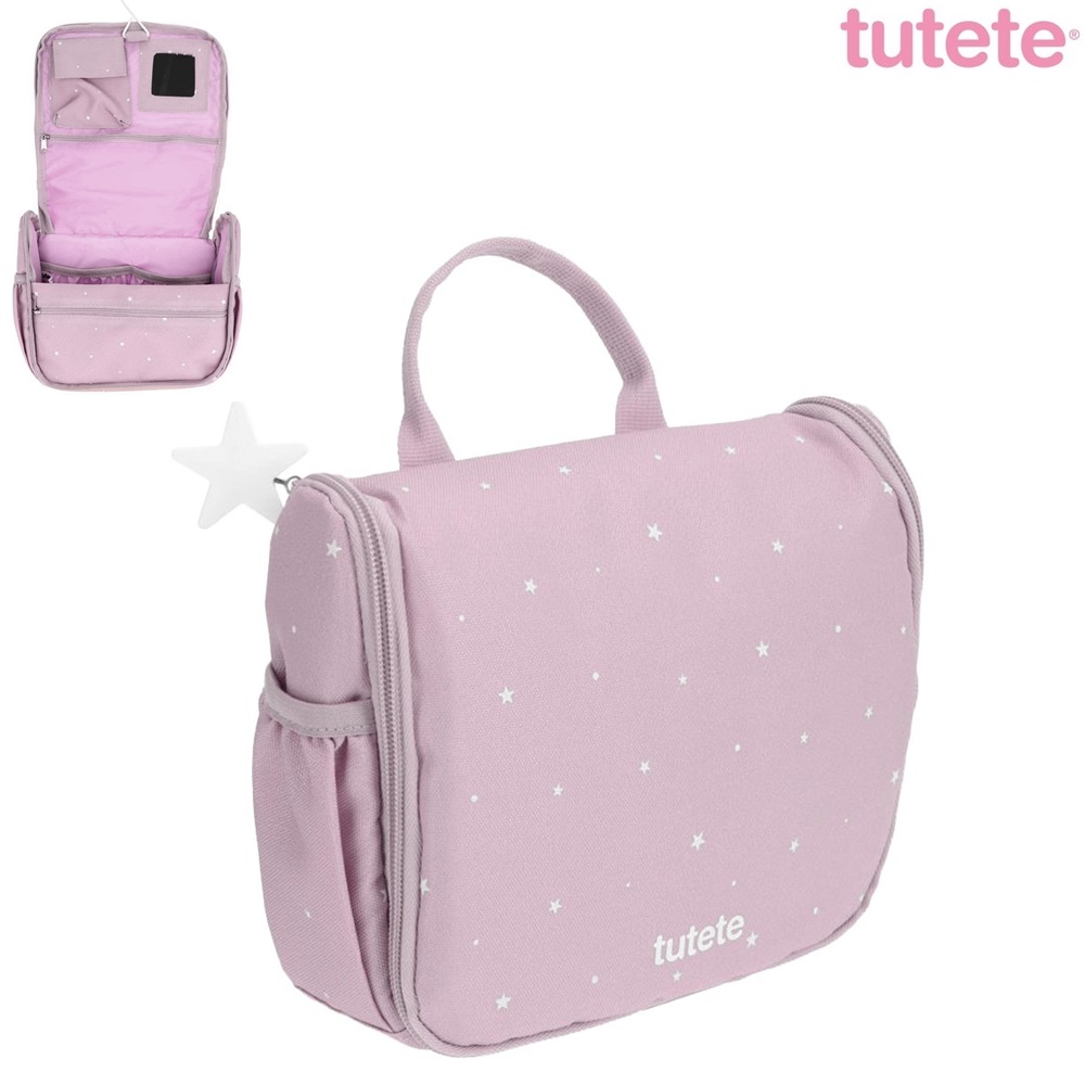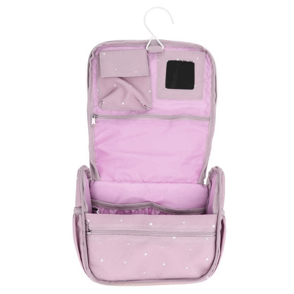 The Tutete Stars Lilac is a stylish and practical toiletry bag designed for children, offering plenty of smart storage options for all travel essentials. Perfect for trips or overnight stays with relatives and friends, this bag keeps everything organized and easily accessible. For convenience, the bag can be hung using the included hanging hook, giving easy access to contents. Inside, there are multiple compartments and pockets, along with a built-in mirror. Additional storage is available on the back and sides of the bag, while a top carry handle makes it easy to transport. Made from water-repellent material, the Tutete Stars Sage protects belongings from spills and is easy to clean.