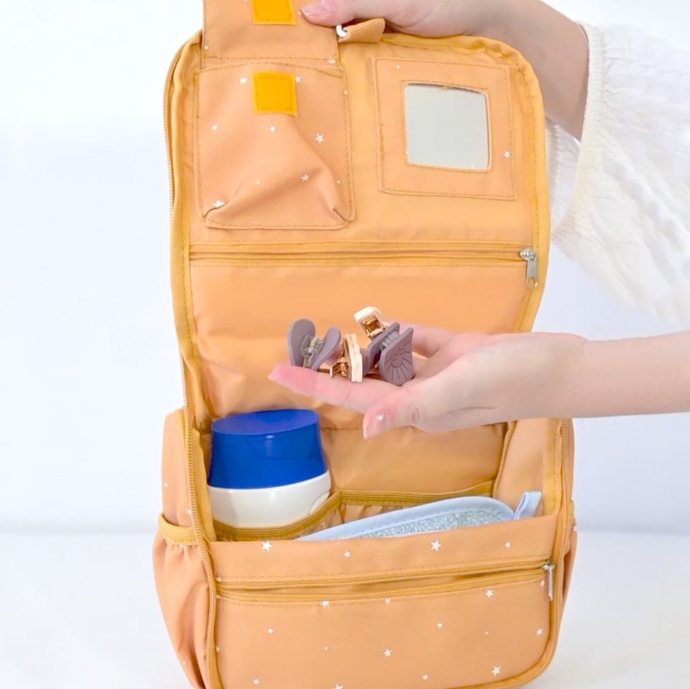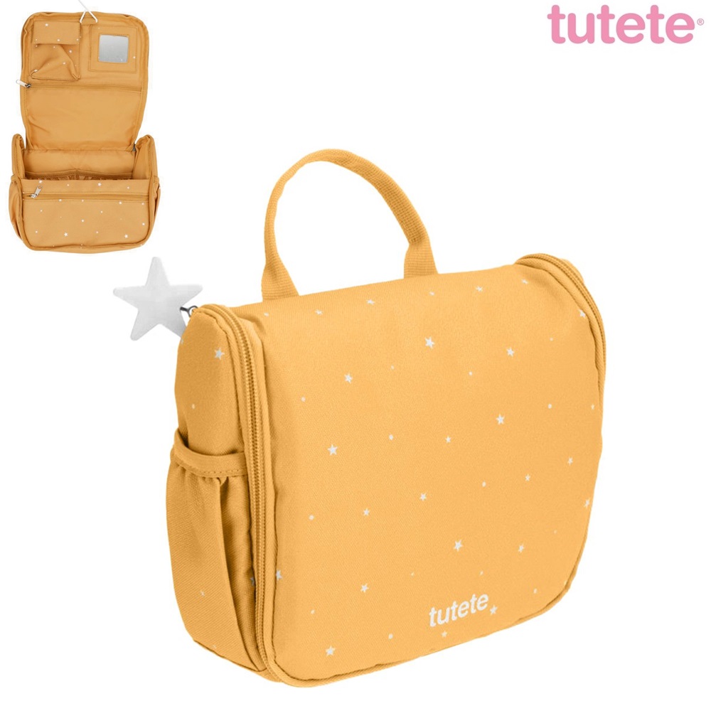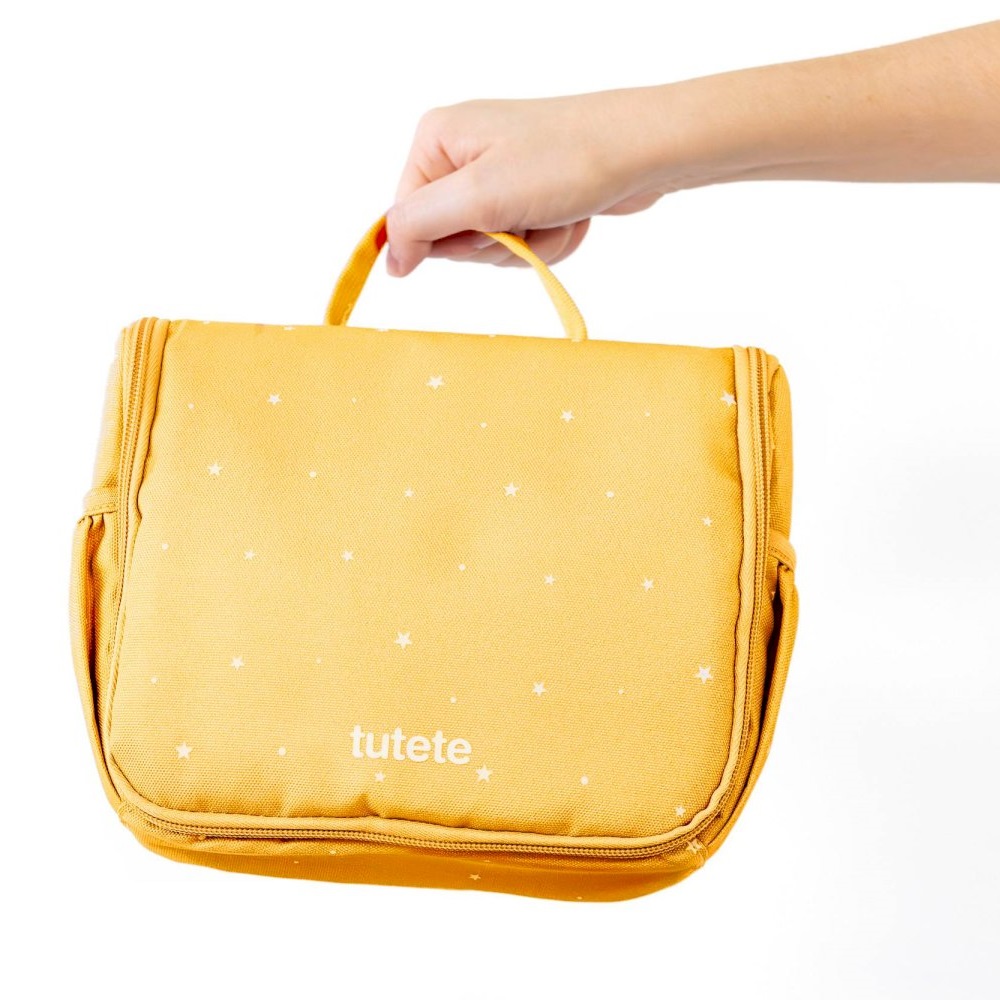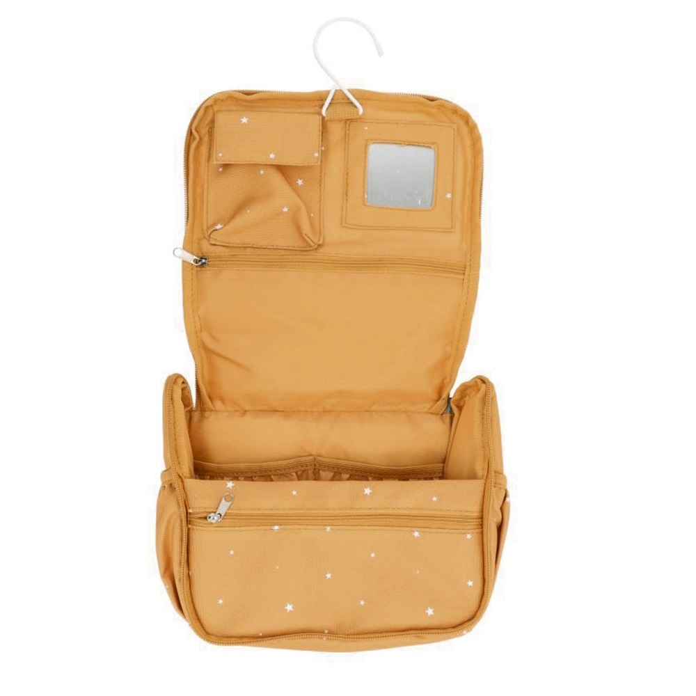 The Tutete Stars Mustard is a stylish and practical toiletry bag designed for children, offering plenty of smart storage options for all travel essentials. Perfect for trips or overnight stays with relatives and friends, this bag keeps everything organized and easily accessible. For convenience, the bag can be hung using the included hanging hook, giving easy access to contents. Inside, there are multiple compartments and pockets, along with a built-in mirror. Additional storage is available on the back and sides of the bag, while a top carry handle makes it easy to transport. Made from water-repellent material, the Tutete Stars Sage protects belongings from spills and is easy to clean.