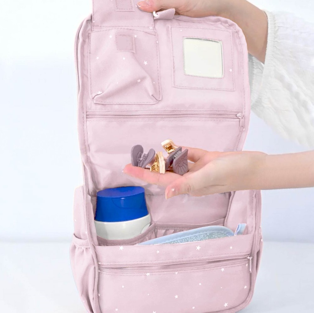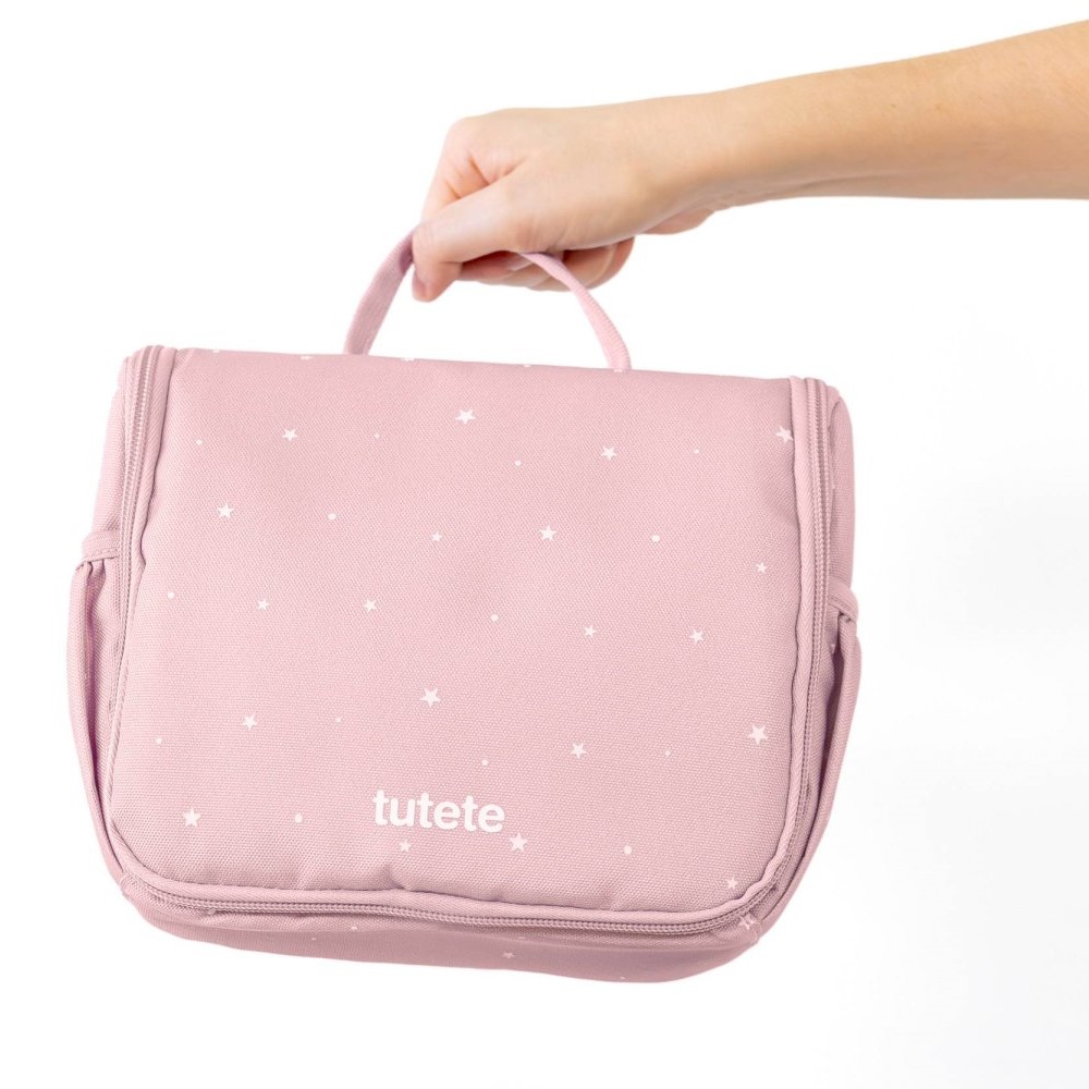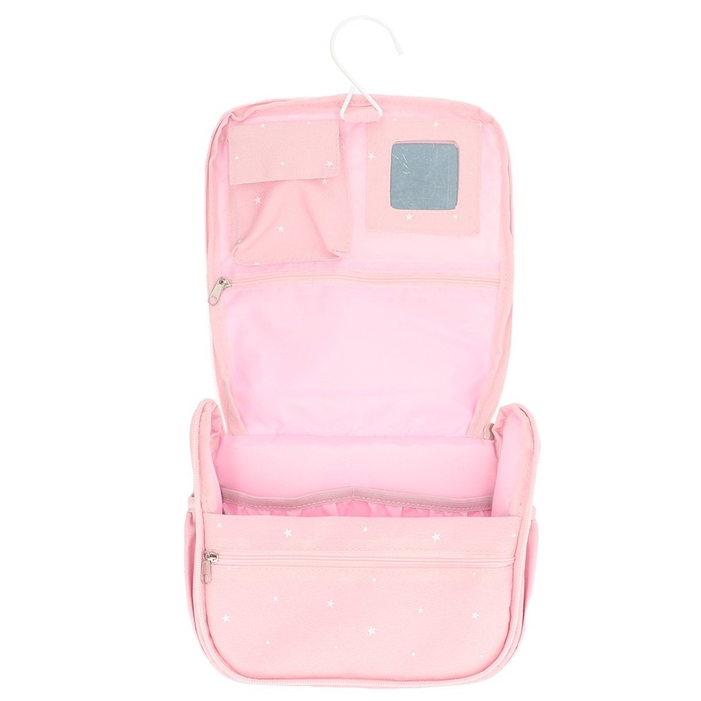 The Tutete Stars Pink is a stylish and practical toiletry bag designed for children, offering plenty of smart storage options for all travel essentials. Perfect for trips or overnight stays with relatives and friends, this bag keeps everything organized and easily accessible. For convenience, the bag can be hung using the included hanging hook, giving easy access to contents. Inside, there are multiple compartments and pockets, along with a built-in mirror. Additional storage is available on the back and sides of the bag, while a top carry handle makes it easy to transport. Made from water-repellent material, the Tutete Stars Sage protects belongings from spills and is easy to clean.