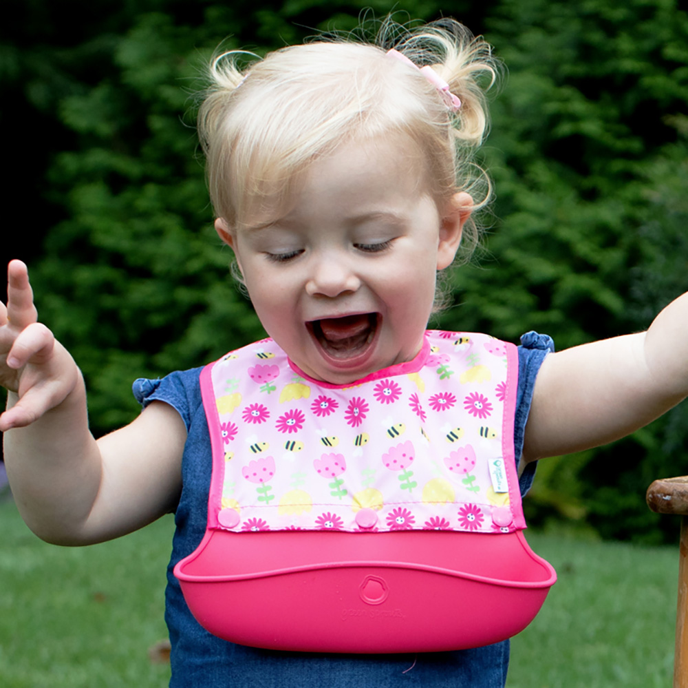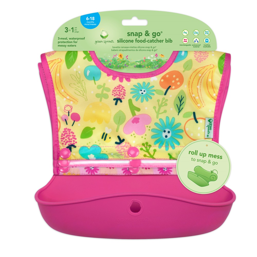 Green Sprouts Snap & Go Bee Floral is a practical and smart set with three different interchangeable bibs with a silicone collector. After feeding, the bib is simply rolled up and fastened so that the contents do not spill out. This means that the bib does not need to be washed immediately after use, but can be taken home and cleaned. The bib has a collector in food-approved silicone. The upper part, which is removable, is made of waterproof material (polyester). The upper part can be washed in a washing machine while the collection pocket is washed separately. Green Sprouts Snap & Go has curved sides so that the bib follows the child's movements. In short, a smart and practical bib for easy use and cleaning that is just as good to take with you on the trip as it is for home use. Take the bib with you in your hand luggage, purse or diaper bag.