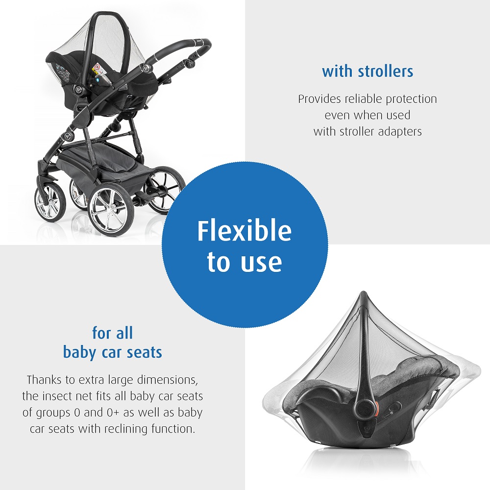 Reer BiteSafe Mosquito Net Black is an elastic and protective mosquito net and insect net for child car seats. The mosquito net is elastic and therefore fits all standard child car seats. Fine mesh, machine washable and free of phthalates. Bring a mosquito net for your trip to warmer countries or as good protection against summer mosquitoes at home.