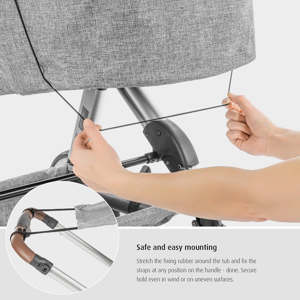 Reer ShineSafe Grey is a universal sunshade for prams and strollers. The sunshade is easy to attach with elastic fastening cords and is also openable when mounted on the pram. A protective and functional sunshade is good to have along in the pram basket, in your handbag or in your daypack for sunny days both when traveling and at home.