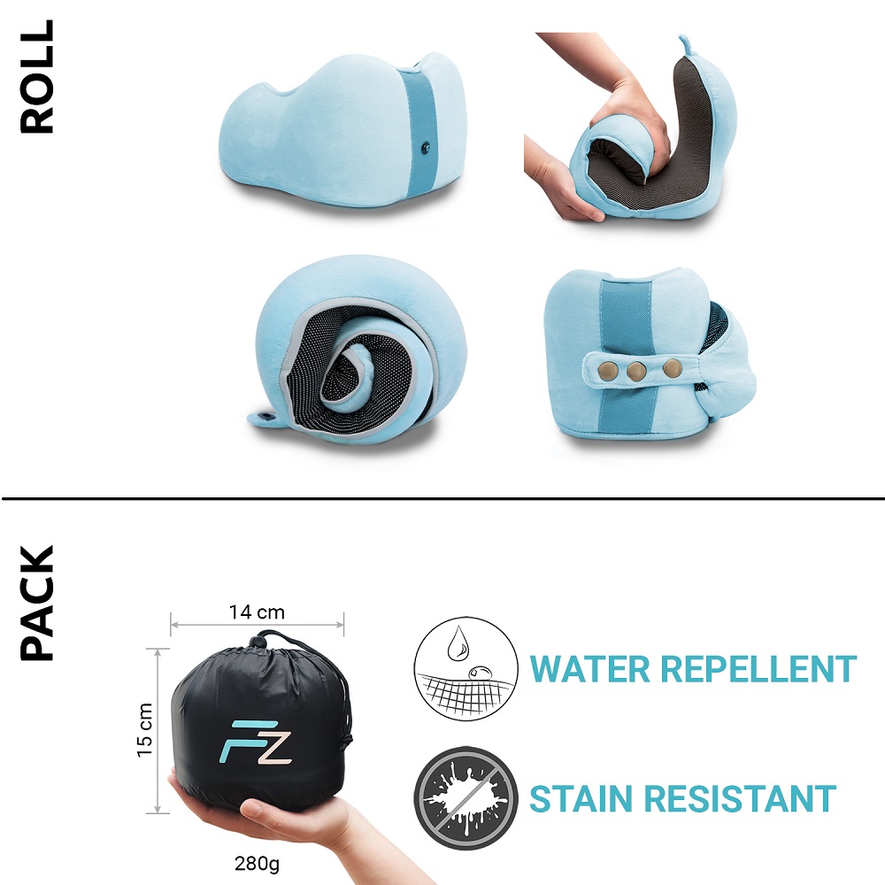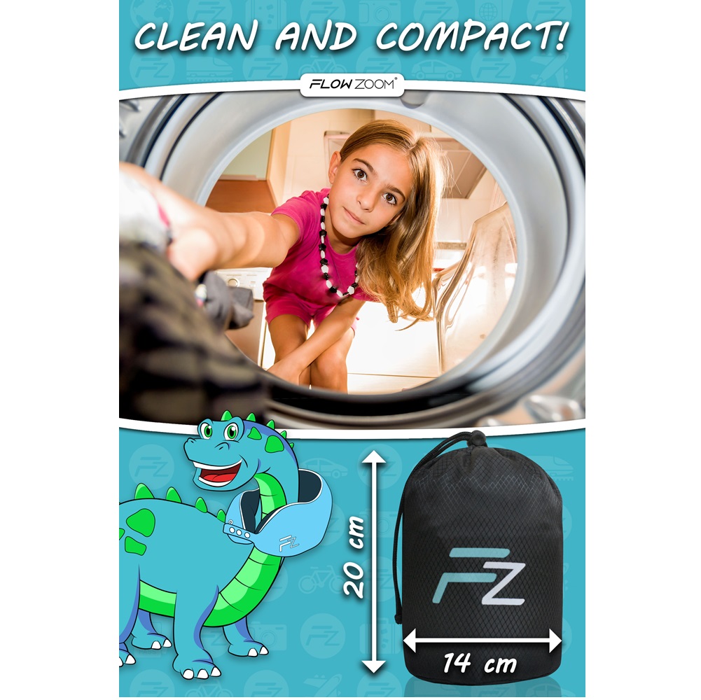 The innovative and comfortable Comfy Kids Blue Medium travel neck pillow from Flowzoom is a perfect companion for your child on the plane, on the train, on the bus or in the car. The neck pillow is ergonomically designed and made in a size that fits the size of a child's head and neck. Comfy Kids is made of comfortable "Breath-Easy" material, which reduces the risk of it getting too warm around the neck pillow. It also has a filling of memory foam, made of antibacterial viscose, which means that the pillow is shaped to the child's head and reduces the risk of the pillow pushing the child's head forward when it leans back. On the front, the neck pillow has a strap and a push button so that the neck pillow can be closed and adjusted in three different sizes. After use, the Comfy Kids neck pillow is rolled up and packed in the included transport bag. When packed, the pillow measures 15 x 14 cm and is therefore easy to take along, for example, in hand luggage.