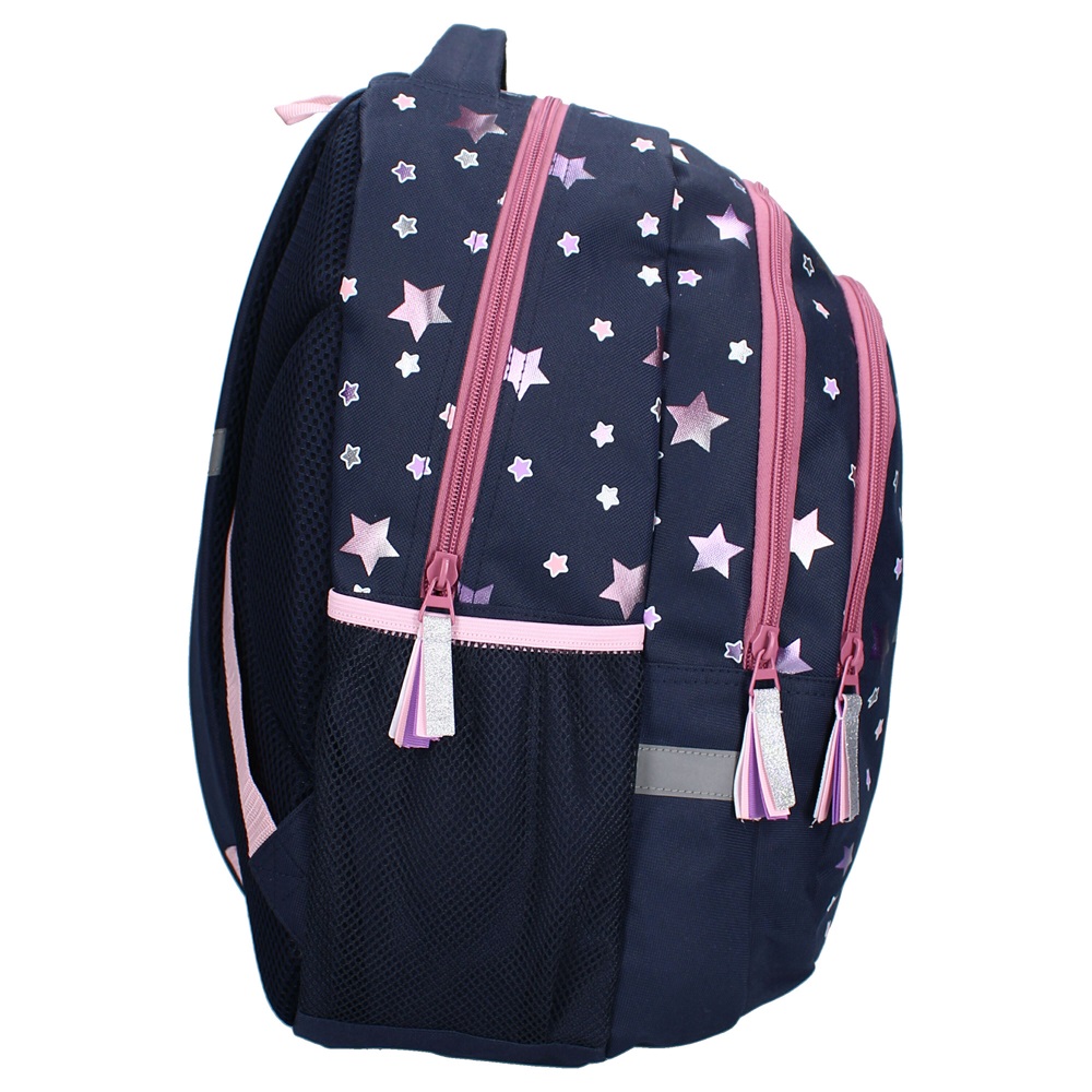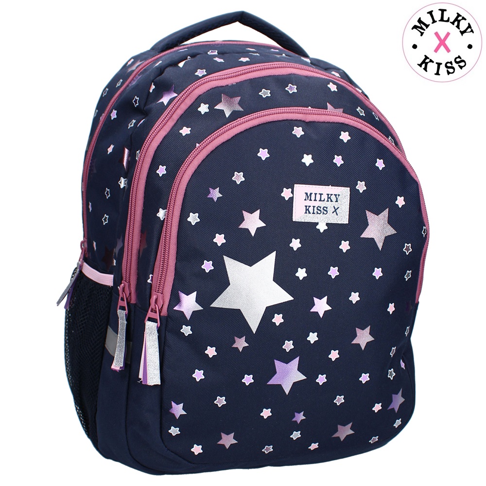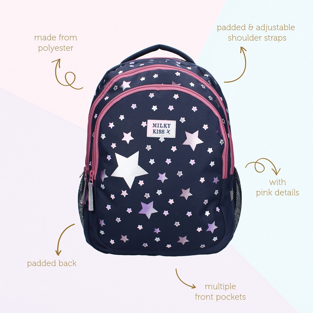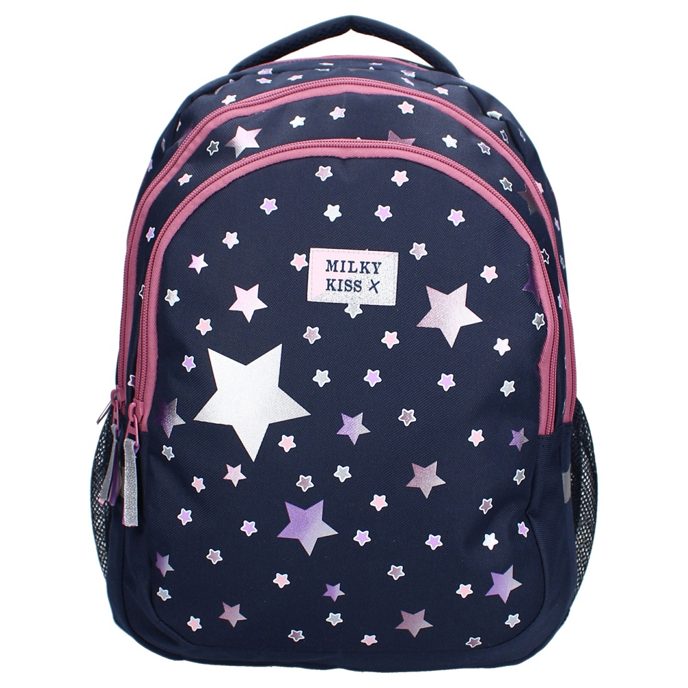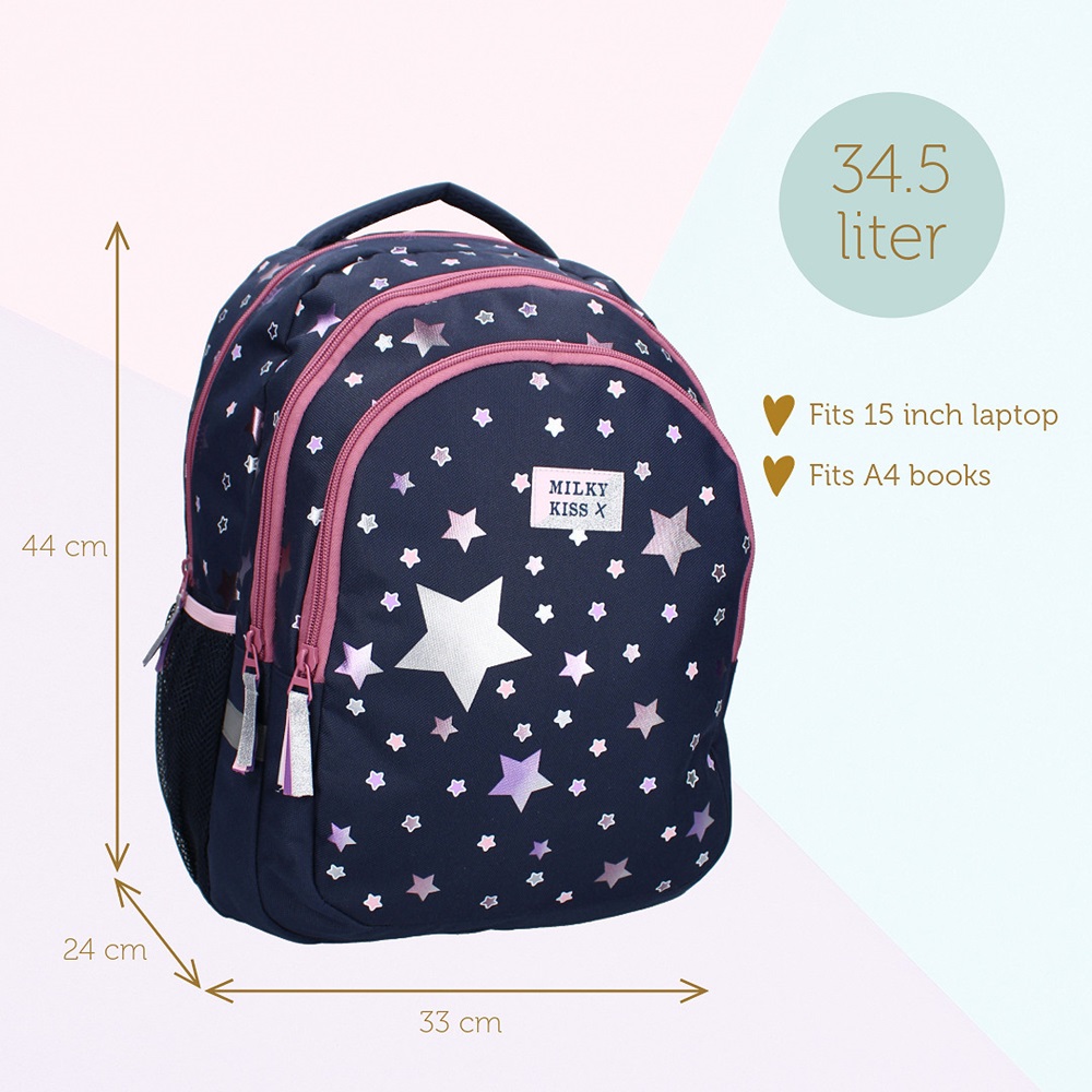 Milky Kiss Fable World is a large, spacious and stylish backpack for slightly older children made in a tough design. The backpack is made of water-repellent polyester and has a total of 34.8 liters of packing space. Milky Kiss Fable World has padded and adjustable shoulder straps, a carrying handle, a large spacious main compartment, two additional compartments and mesh bottle holders on the sides. The backpack is suitable both as a school bag and for travel.