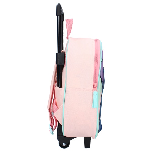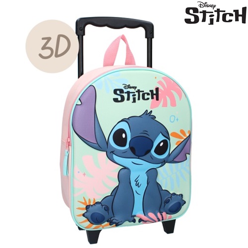 A small suitcase for younger children with a cute Stich motif in 3D (the image sticks out from the front of the bag). The suitcase has a telescopic handle, carrying handle, two wheels and support legs at the front so that the bag can be placed vertically. Hidden on the back of the suitcase are also padded and adjustable straps so that the bag can be worn as a backpack. The main compartment of the suitcase holds toys, teddy bears, snacks and other things that shall be taken on the trip. The children's suitcase Stich Sweet but Spacey works well both as hand luggage on the plane and as a small gadget bag to take with you on visits to family and friends.