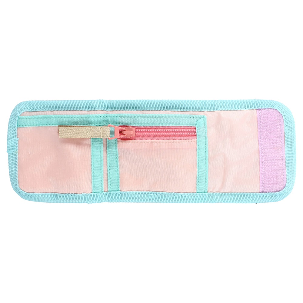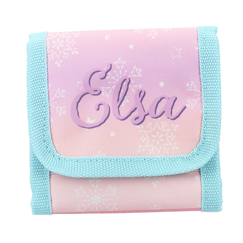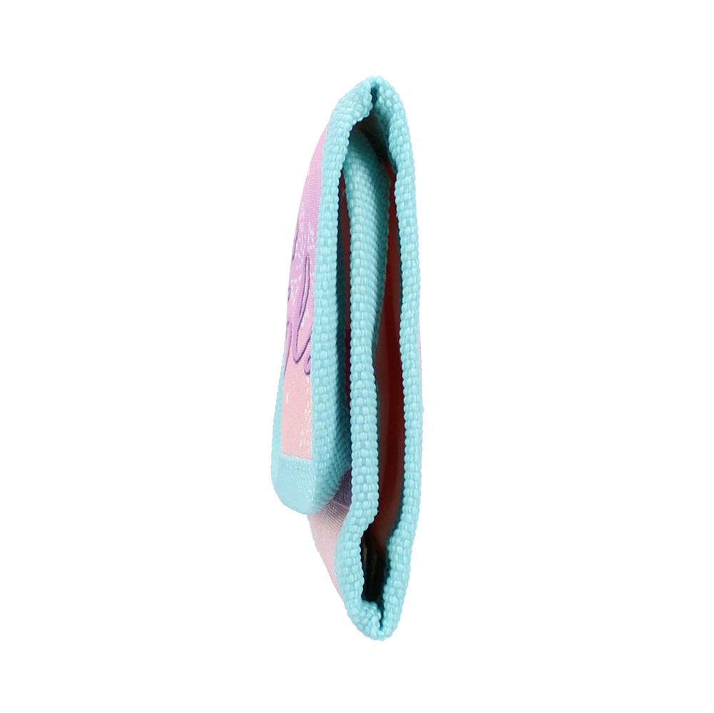 Cute and practical wallet for kids. The Frozen It's All Magic wallet is foldable and small (10 x 10 cm) enough to fit in your kid’s pocket or bag. Inside the wallet is a banknote compartment, space for cards and a coin pocket that closes with a zipper. The wallet is folded and closed with velcro.