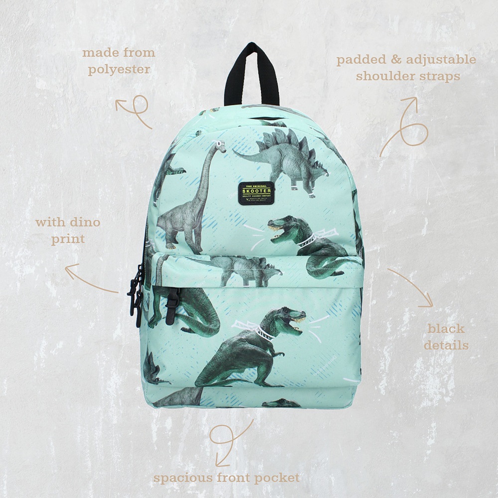 Skooter Dino Explorer is a stylish, durable and functional backpack for children made in a nice design. The backpack has a spacious main compartment, a smaller pocket on the front of the backpack, adjustable and padded shoulder straps and a carrying handle.