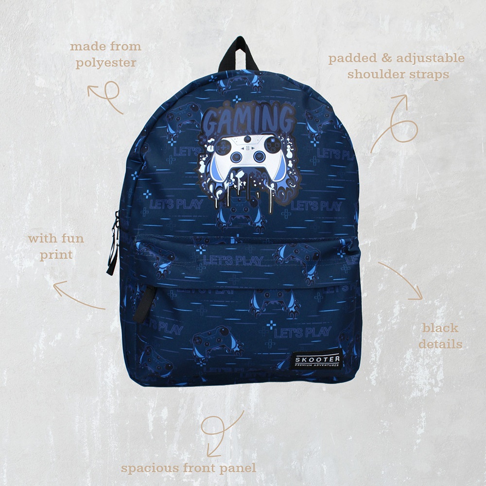 Skooter Gamers Unite is a stylish, durable and functional backpack for children made in a nice design. The backpack has a spacious main compartment, a smaller pocket on the front of the backpack, adjustable and padded shoulder straps and a carrying handle.