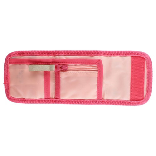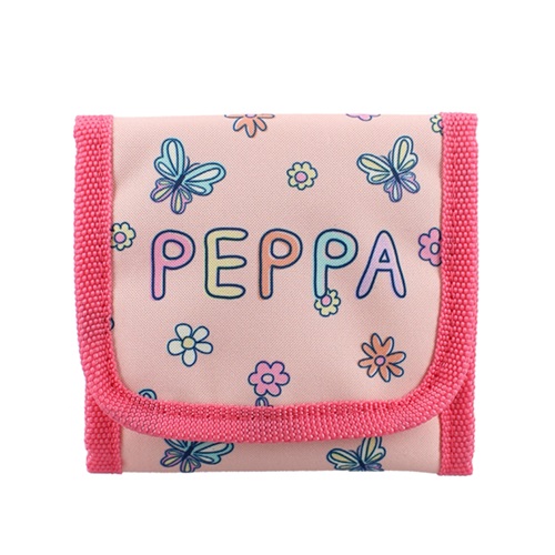 Cute and practical wallet for kids. The Peppa Pig I Love It wallet is foldable and small (10 x 10 cm) enough to fit in your kid’s pocket or bag. Inside the wallet is a banknote compartment, space for cards and a coin pocket that closes with a zipper. The wallet is folded and closed with velcro.