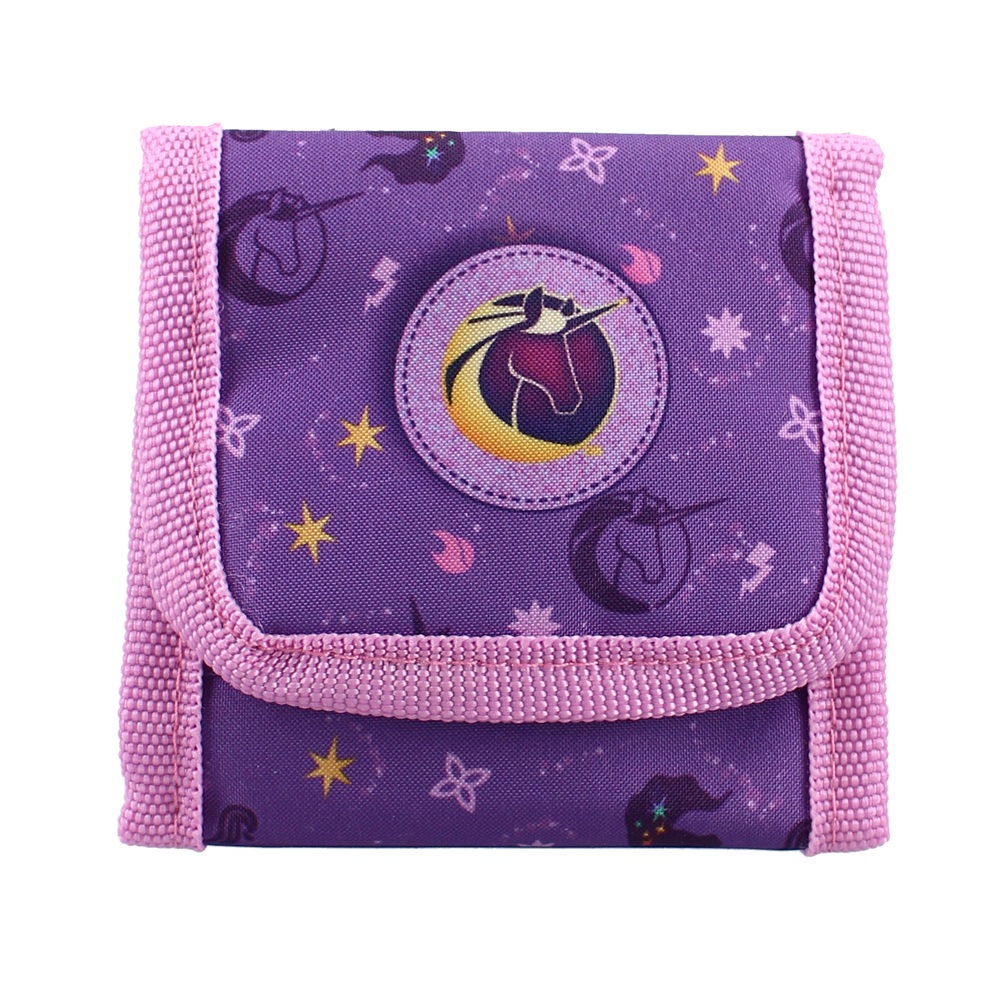 Cute and practical wallet for kids. The Unicorn Academy It's Fate wallet is foldable and small (10 x 10 cm) enough to fit in your kid’s pocket or bag. Inside the wallet is a banknote compartment, space for cards and a coin pocket that closes with a zipper. The wallet is folded and closed with velcro.